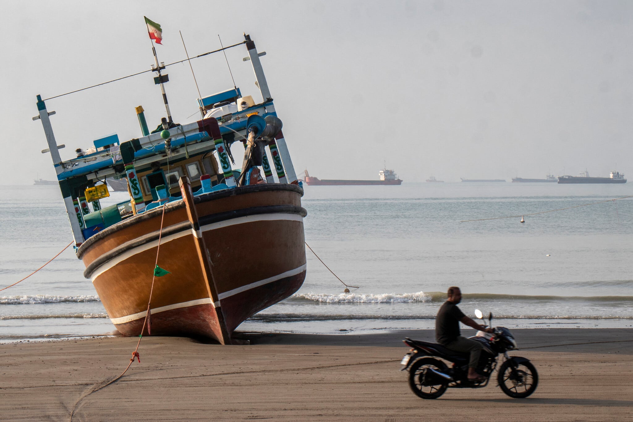 In this picture obtained from Iran’s ISNA news agency on April 24, 2026, an Iranian man rides his motorcycle past a boat at Suru Beach in Bandar Abbas along the Strait of Hormuz. (Razieh Poudat/ISNA/AFP)